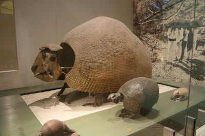And here’s a lovely trio of cingulates! The big fellow is the derived glyptodont Panochthus, the medium-sized fellow is the early glyptodont Propalaeohoplophorus, and off towards the back the little guy is the extant six-banded armadillo, Euphractus sexcinctus. The tail club on the Panochthus is mounted really weirdly, with it sticking straight out from the back of the shell rather than having any of the mobile rings from the base of the tail present, so I’m not sure what’s quite up with that.