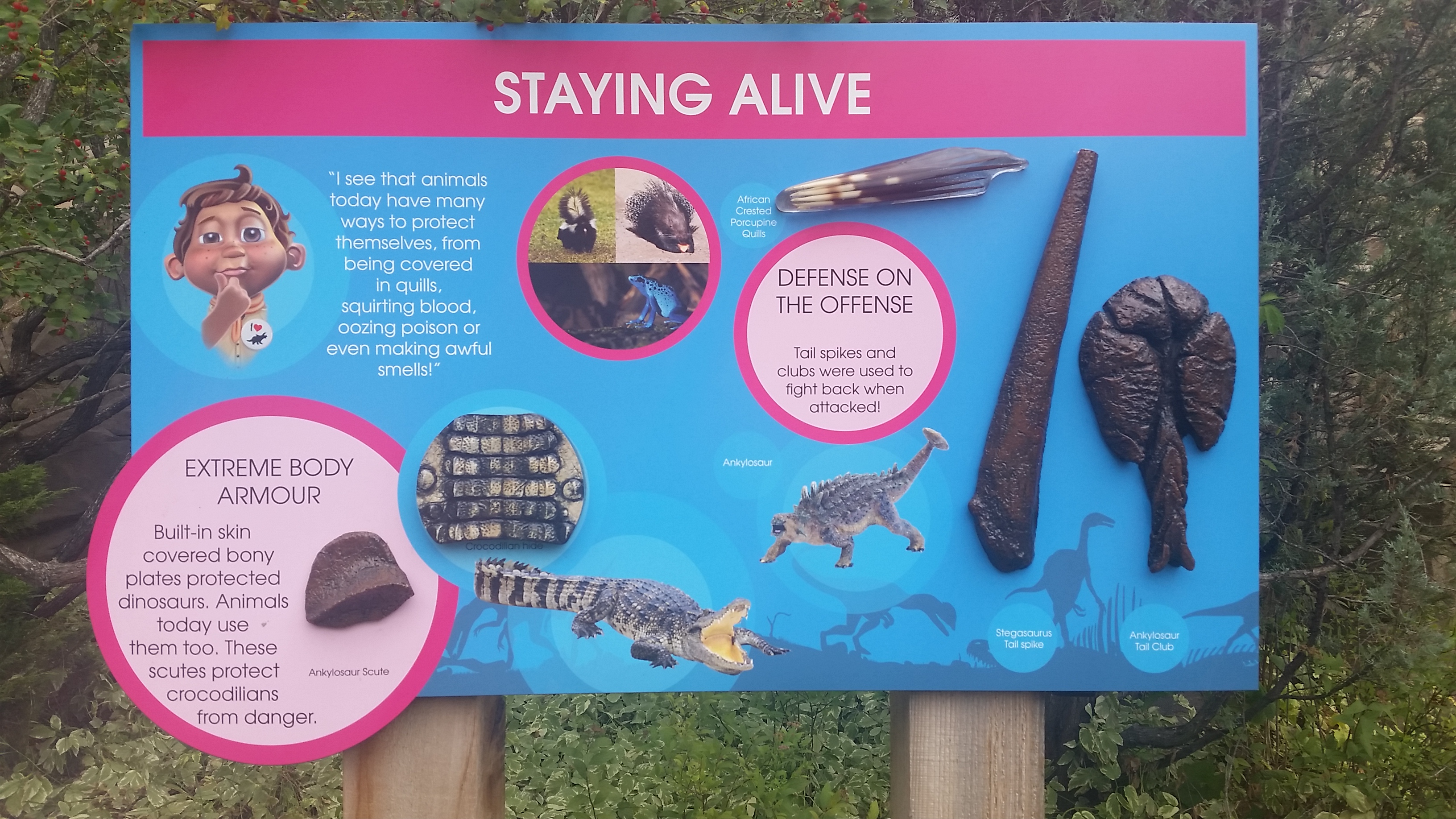 These interpretive signs all stem from a 2010s-era refurbishment of the Prehistoric Park and are probably the most effective vehicle for linking evolution, dinosaurs, and other animals on display at the zoo. I’m partial to this sign showing off different weapons and armour, and I like that there are touchable objects here.