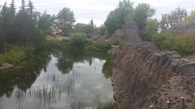 The dinosaurs in Prehistoric Park aren’t arranged chronographically as in many museums, but are instead presented in different habitats and ‘geographic’ regions, like swamps, deserts, and volcanic mountains. This makes sense in the context of a zoo, and particularly the Calgary Zoo which groups animals by biome and geographic region, but works a bit less well here, in my opinion. I didn’t realize that’s what this area was going for until I sat down to write this blog post, and dinosaurs among columnar basalts threw me for a bit of a loop. Perhaps with more signage this sort of arrangement could work really well, highlighting how animals of the past occupied different environments, just like animals of today.