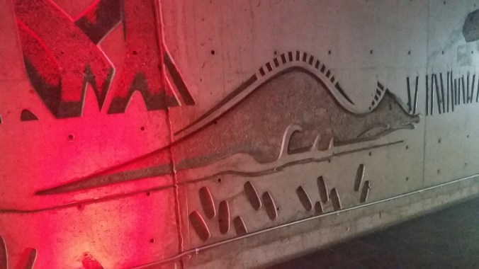 I also had to share the really cool graphic design of these wall carvings at the entrance to the zoo – one wall features prehistoric life, and the other wall features extant animals at the zoo. I like this Saurolophus a lot.