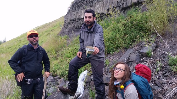 My very favourite photo from the Sustut Basin 2017 expedition, with David Evans (left), Tom Cullen (centre), and Jade Simon (right). I had made us walk like 7 km in a hurry through extremely wet abandoned railway tracks to what should have been a very promising outcrop. There were zero fossils. We named it Arbour’s Bluff and ate some chips.