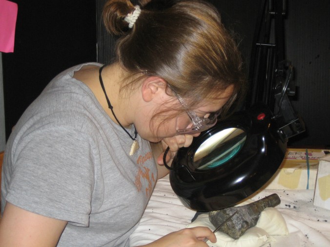 Me, circa summer 2005-ish, doing some minor prep on the tibia with my fancy new magnifying lamp, wearing a necklace of a Stegosaurus made out of moose antler, also with essentially the same hairstyle I wear today, oh god where did the years go.
