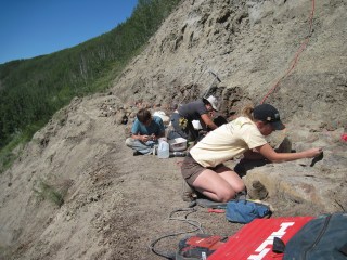 The first paper I’ll talk about is not one that I’m lead author on, but which was a really fun project to be involved in. This was the description of a super cool specimen of a hadrosaur from the area around Grande Prairie with some impressive skin impressions. UALVP 53722 was collected as a large block that had fallen along the creekside. Unfortunately, the rest of the skeleton could not be located, which might mean it’s still in situ somewhere with nothing visible, or it had already broken apart into unrecognizable pieces. The block preserves the back of the skull with the neck arched over the shoulders, the classic ‘death pose’ seen in many dinosaur skeletons. Most of the skull is missing, but what is present shows that it is an Edmontosaurus regalis, the slightly older species of Edmontosaurus.