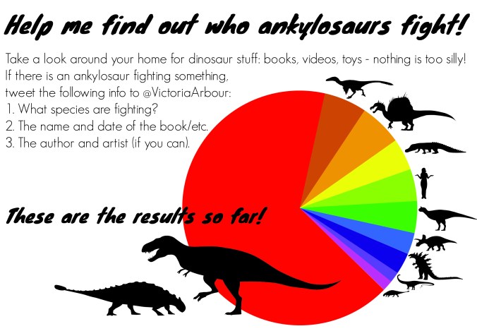Since January 2016 I’ve been collecting information about how ankylosaurs are portrayed in the popular media. If you’ve got a book, video, poster, or any kind of piece of art or text that talks about ankylosaurs fighting ANYTHING, you can tweet it to me or tell me about it in the comments at this blog post. I’ll be using this information to develop hypotheses of ankylosaur intra- and interspecific combat behaviour!