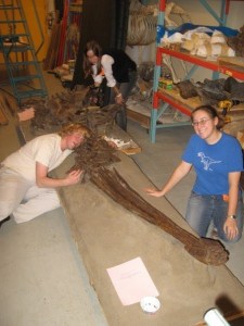 Last December the three of us published a paper in the Journal of Vertebrate Paleontology redescribing and resurrecting Dyoplosaurus, an genus of ankylosaurid that had previously been sunk into Euoplocephalus. Here we are examining the type (and only) specimen in the Royal Ontario Museum’s collections. We are very photogenic. Many thanks are due to David Evans and Brian Iwama who made time to help us during the final phases of the very busy ROM Crystal palaeo gallery reopening!